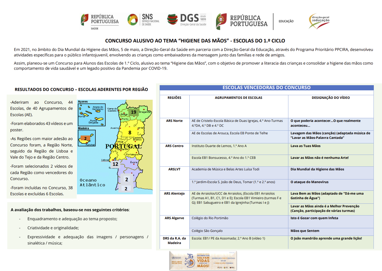 Concurso “Higiene da Mãos” Publicado a Junho 9, 2021 por Administrador O Agrupamento de Escolas de Arraiolos foi um dos vencedores do concurso alusivo ao tema “Higiene da Mãos” – Escolas do 1º ciclo – Cidadania, promovido numa parceria entre a Direção-Geral da Saúde e a Direção-Geral da Educação.