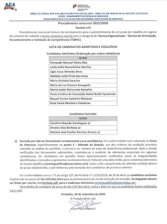 Informa-se que se encontra aberto o procedimento de seleção e recrutamento de técnico especializado -TORVC para o ano letivo 2025/2026. Para mais informações consulte o Aviso de Abertura.